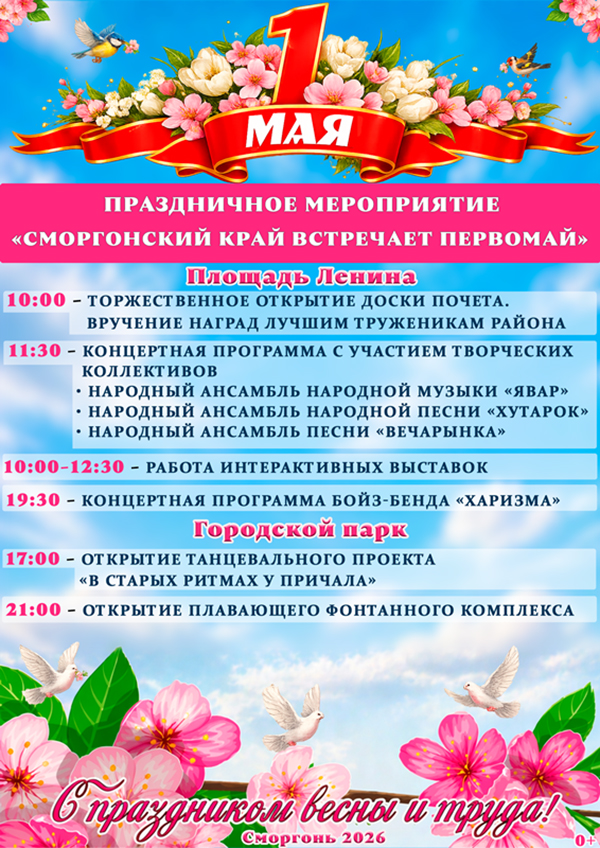 В ближайшее время состоится праздничное мероприятие «Сморгонский край встречает Первомай».Жителей и гостей города ожидает насыщенная программа: концерты, выставки, интерактивные площадки и развлечения для всей семьи. Организаторы приглашают всех присоединиться и вместе встретить Первомай в праздничной атмосфере.
